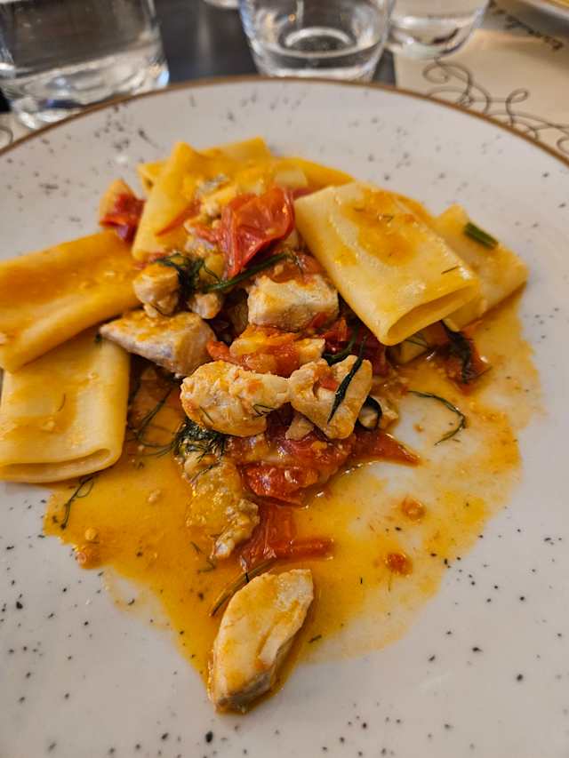 7.5/10+1We had lunch there - pasta with cod, pasta with lobster and shrimps risotto. It was kind of stuffy inside, even though it was October. The food was generally good but arrived at less-than-average pace, given that the place was almost empty. I didn't get the lobster cutlery set and had to dig for the meat with a fork. I also had to go to the waitress to ask for the menu, when we wanted to choose dessert (the milk cream that resembled panna cotta was average, too much cinnammon on it; tiramisu was good). I wouldn't go there second time.