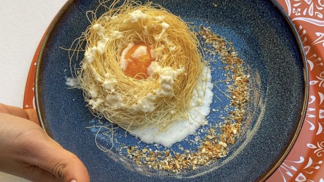 Uovo CBT in pasta kataifi e fonduta di parmigiano