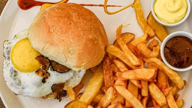 Our homemade fries with 24 month D.O.P. Grana cheese and homemade Vegan mayonnaise with local Black Truffle.