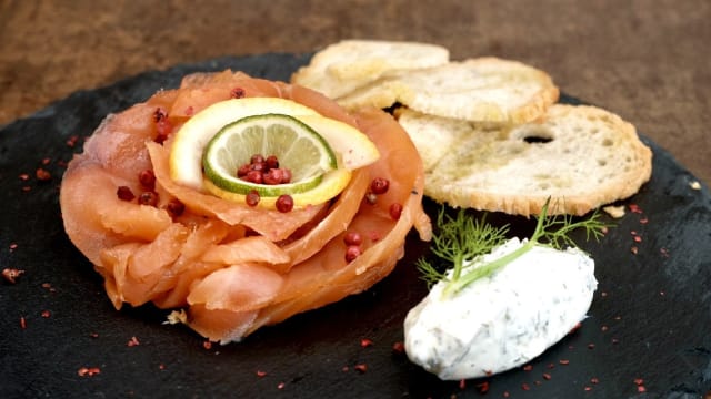 Citrus marinated Salmon,mango andlime emulsion, fresh strawberries, pink pepper and pistachio grains, cream cheese, rocket salad, lemon zest and black bread with charcoal/French fries included.
