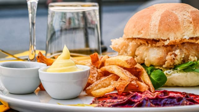- Marinated, breaded and fried Cod, crunchy iceberg salad, Artburger mayonnaise and charcoal black bread /French fries included