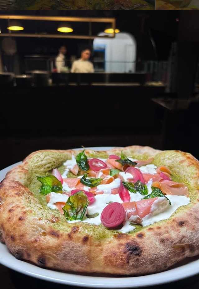 - Crema di pistacchio, provola affumicata, mortadella di suino nero, stracciatella, polvere di pistacchio, basilico e olio evo