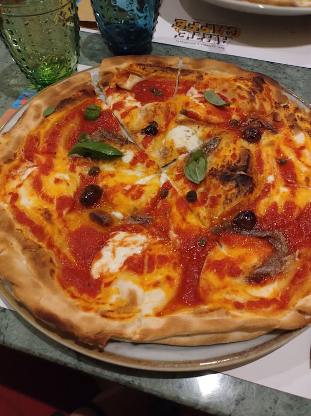 - Crescenza, salsa di pomodoro, olive. Acciughe, capperi, ongano""