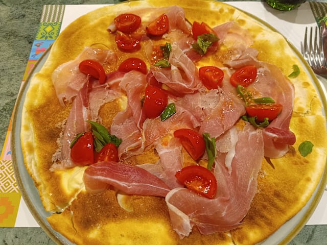 - Crescenza, prosciutto crudo di parma, pomodorini freschi, basilico