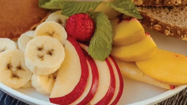 Avocado, uova strapazzate, bacon croccante, pancakes, brie, spinaci saltati con burro, pomodoro, pane tostato burro e marmellata, frutta fresca