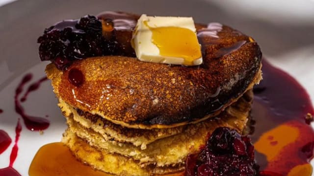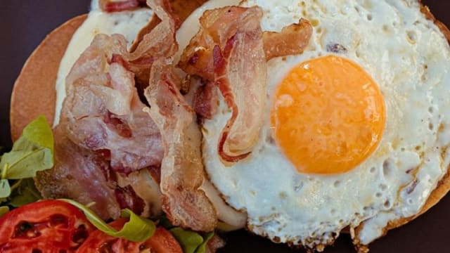 Pancake con uovo fritto, bacon croccante e provola dolce
