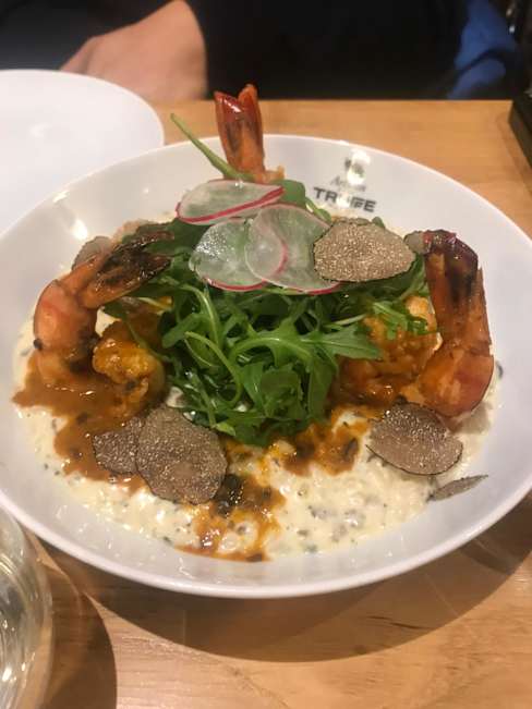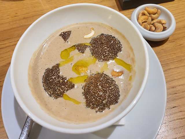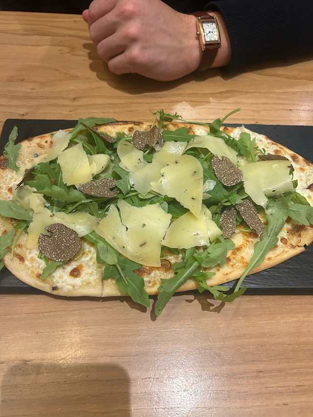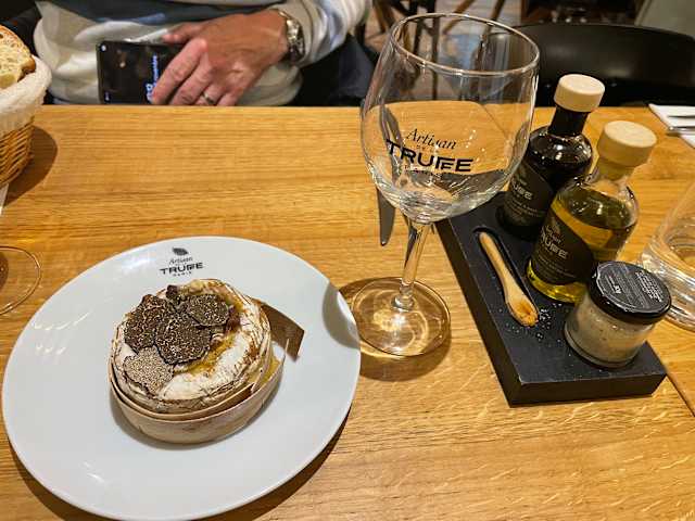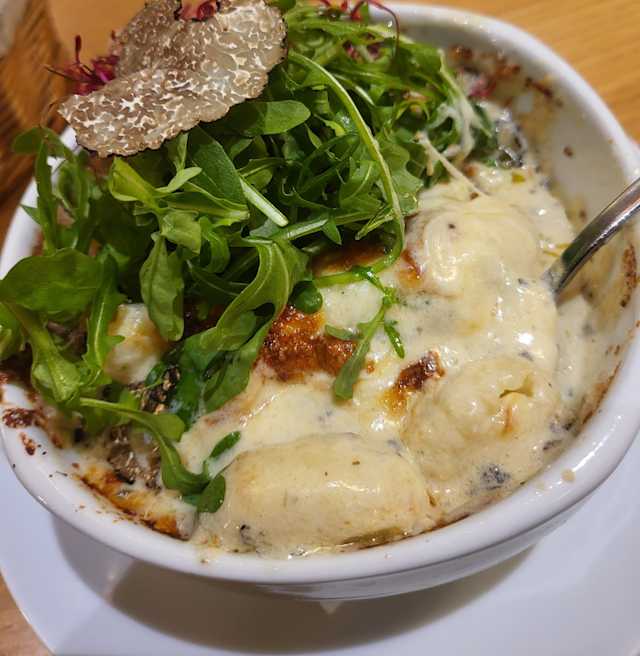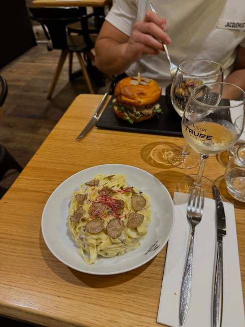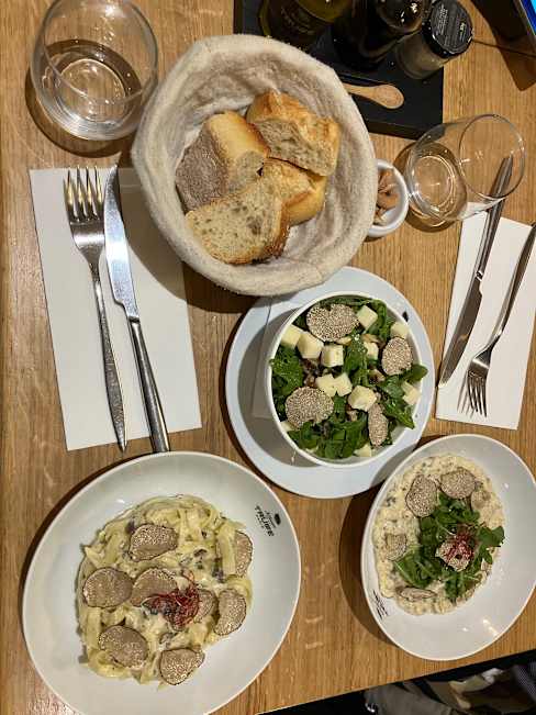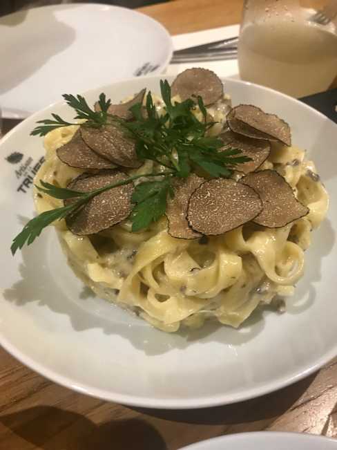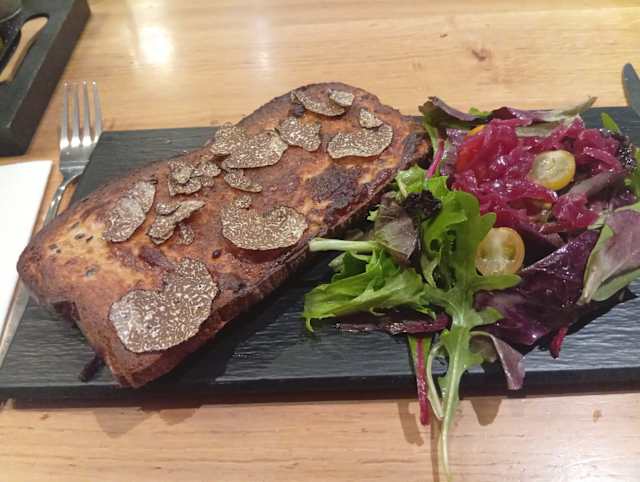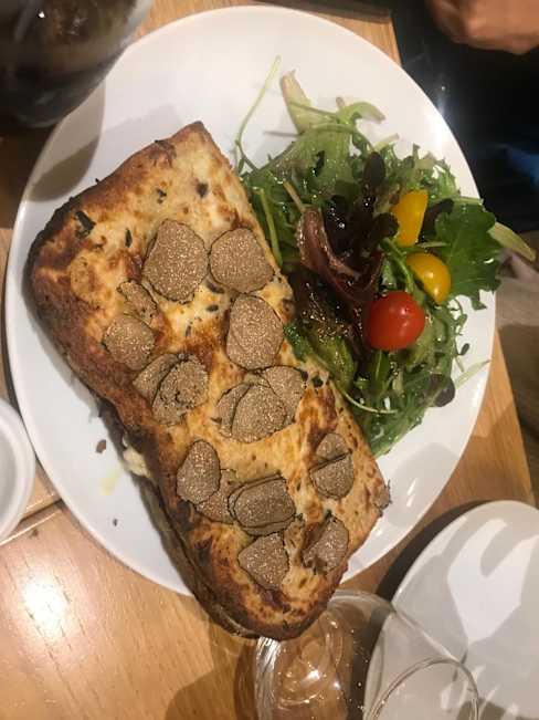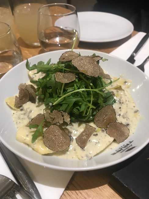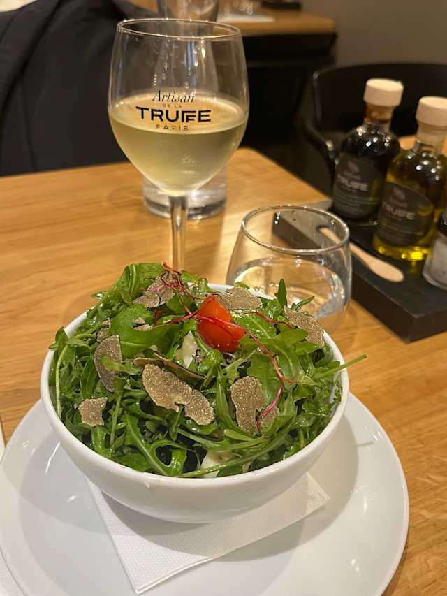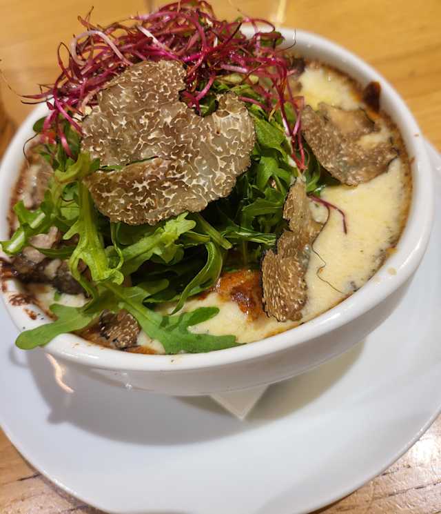 6/10Truffles were white kind and not too much flavor. Wine was good but champagne was flat first time around and was served in a wine glass. Read was good but tables kind of jammed into a small room in the back salad was small but flavorful. Bill for 2 with no dessert was $102e