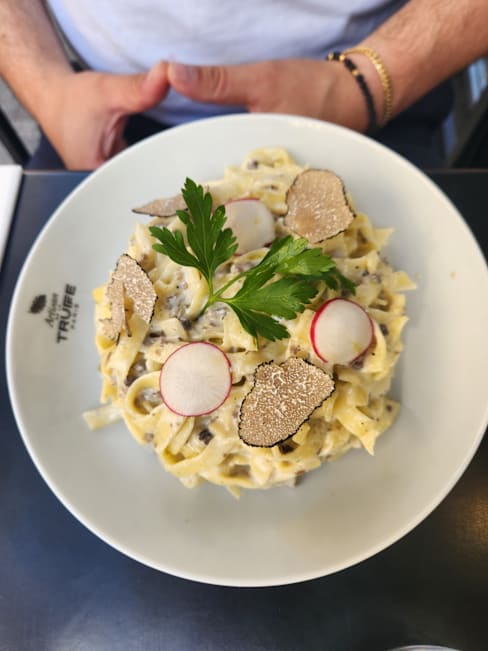 Dear Florence Thank you for your detailed feedback! We’re delighted to hear that you found the risotto fantastic and that your friends enjoyed the ravioli with truffles and the foie gras. We appreciate your honest thoughts on the pasta dish and will share your comments with our team to ensure the best experience for all our guests. Regarding the background music, we sincerely regret that it affected your comfort. Our goal is to create a warm and inviting atmosphere, but we understand that preferences vary. We’re always happy to adjust the volume when possible, and we truly appreciate your patience. We hope to welcome you back soon for another delicious truffle-filled experience—perhaps at a table farther from the speakers! 😉 Best regards, The Artisan de la Truffe – Marais Team