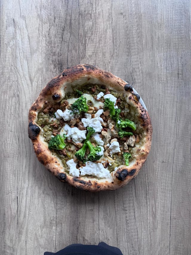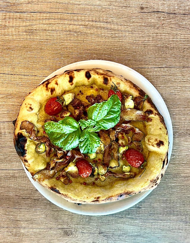 Pizza bianca, provola, funghi porcini e crema di prezzemolo