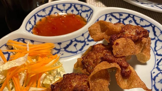 Een krokant pakketje met kipgehakt, krab en Thaise kruiden (3 stuks)