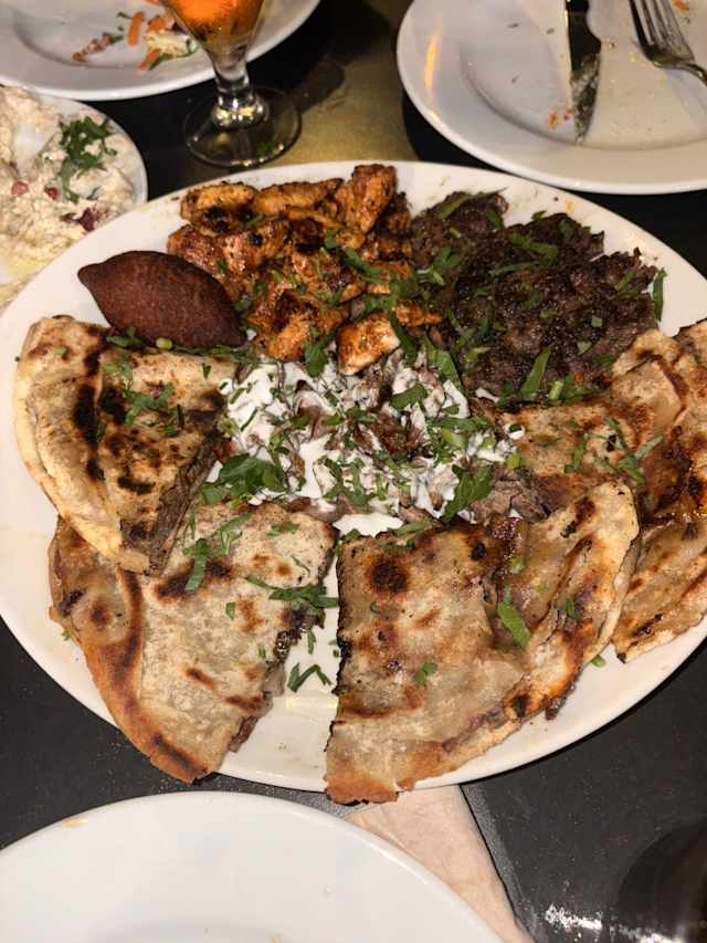 - Pita libanesa rellena de ternera, queso mozarela, cebolla, tomate a la plancha, zumo de granada, acompañada de ensalada