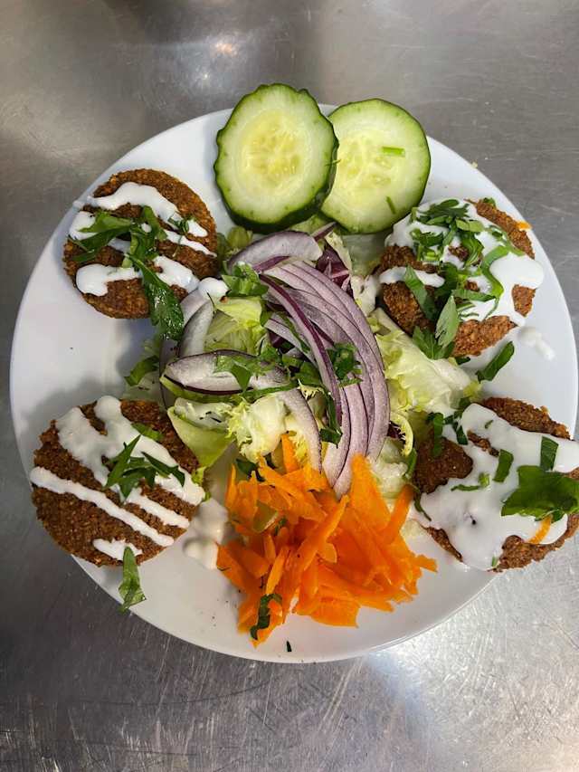 - Ensalada de lechuga, tomate, cebolla, pimiento verde, pepino, rábano, perejil, menta fresca y falafel, aliñada con limón y salsa de sésamo de yogur