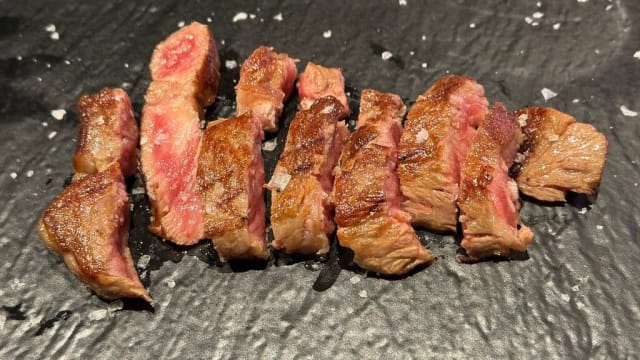 Nigiri di scottona al flambé, balck pepper sauce, sesamo e sale maldon