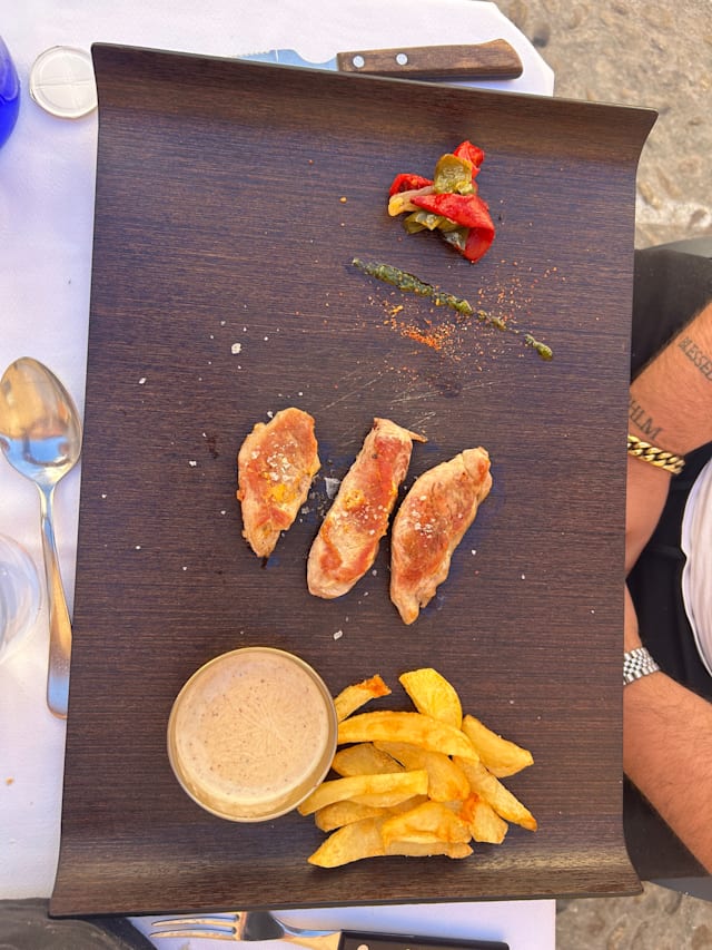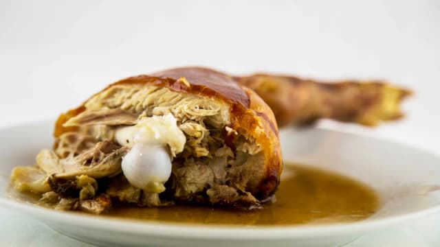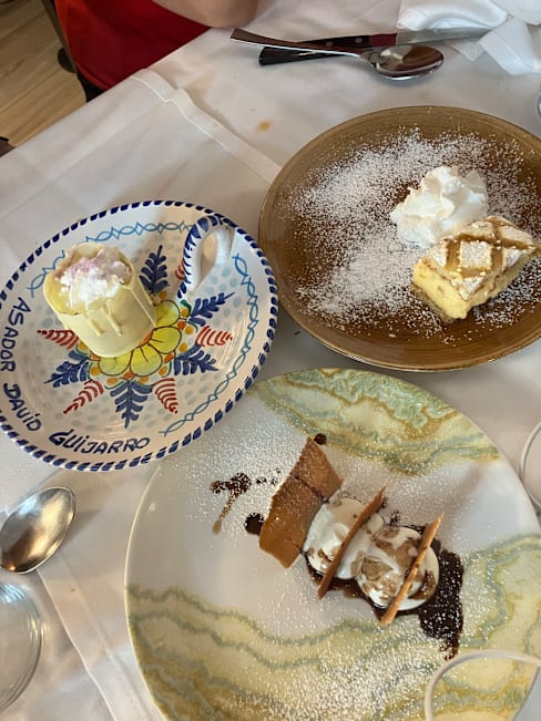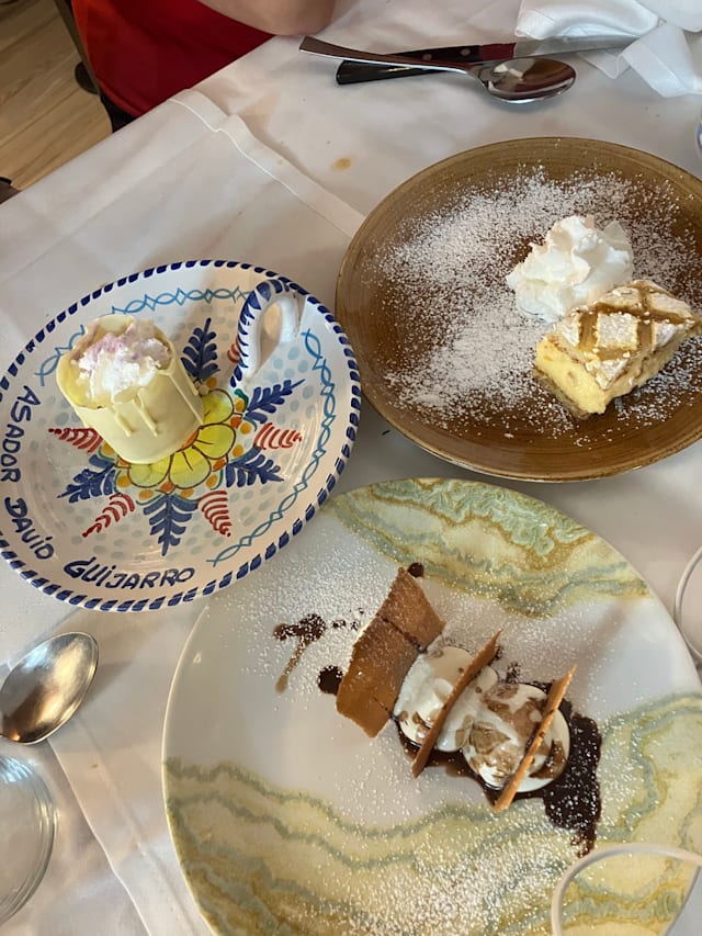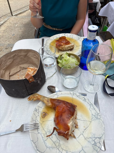 7.5/10We arrived at 1 pm for our reservation but they were not yet fully prepared for diners. They wanted us to choose the 3 course pre-set menu, but we are not huge eaters and knew that what we would order was sufficient for us and very reasonably priced with the Fork discount. The Segovian Patatas- more like a soup -was exceptional! Suckling pig- not quite as crispy as we have had at other restaurants, but Still good. this dish had a tiny salad as accompaniment. I ordered a glass of Cava but they only had full bottles. bread was OK. The waitstaff could be more on point, but overall still good experience.