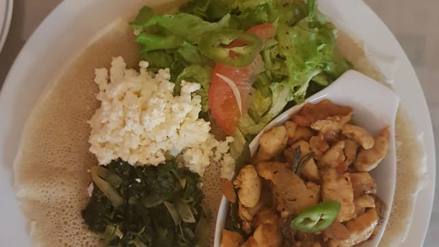 Poulet en sauce aux épices d'éthiopie, avec salade et aib (fromage