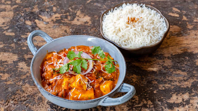 Hausgemachter paneer gekocht in einer würzigen currysauce mit frischen zwiebeln und paprika.