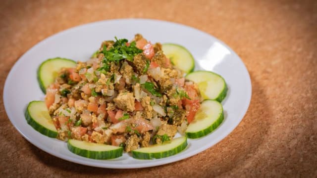 Caviar d'aubergines fumé , mélange de légumes haché, huile d'olive et des épices .