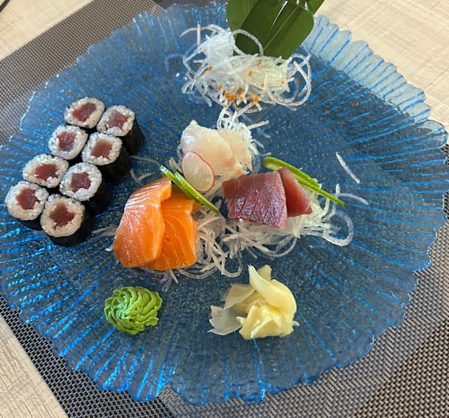 4 pares de nigiri, 6 maki, 3 cortes de sashimi, 1 rollito especial