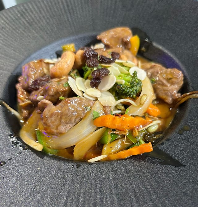 Hecho con lychees, berenjena, cilantro, cacahuetes y verduras con un toque de especias picantes