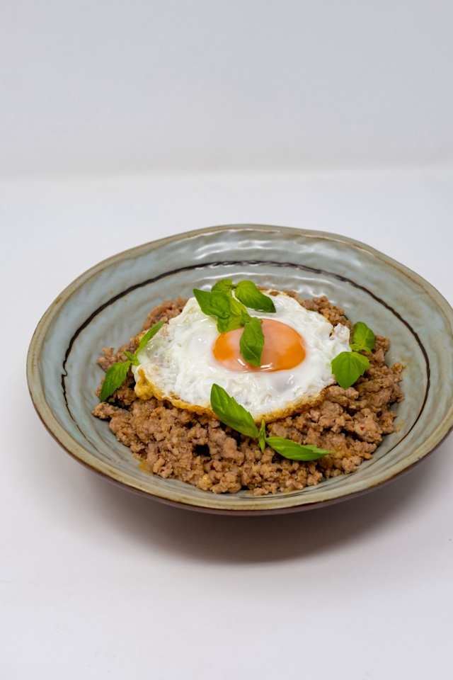- Riso basmati, maiale macinato, aglio, cipolla, peperoncino, thai sauce, basilico, uovo fritto.