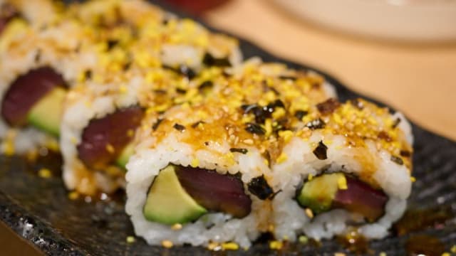 Anguila, aguacate, salsa anguila con sësamo