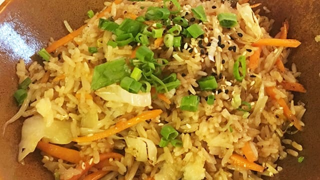 Curry medianamente picante, con leche de coco y verduras frescas, cocinado al estilo thai. A elección carne de ternera, pollo o tofu. Servido con arroz blanco.