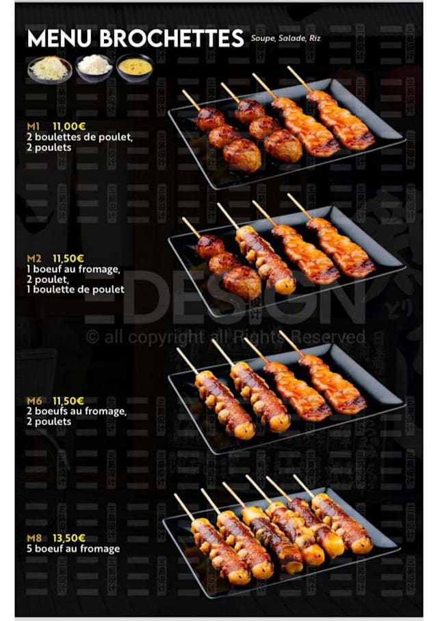 (vous pouvez choisir en plus une option parmi) - 4 brochettes (2 poulet, 1 boeuf au fromage, 1 boulette de poulet) ou 8 california (avocat saumon) ou 4 sushi mix ou 8 sashimi saumon ou 12 maki assortis
