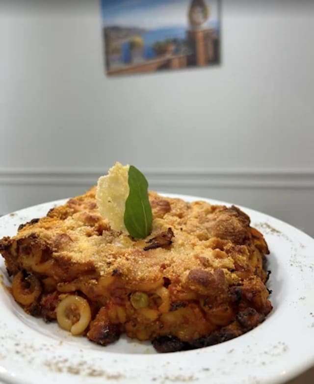 Pizza farcita al ragù e mozzarella e rivestita con pasta sfoglia.