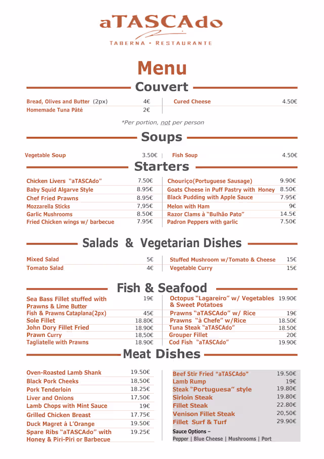 Atascado in Alvor has it all in abundance. We were so glad we found this gem ,delicious cuisine ,impeccable service from both gentlemen, great atmosphere and vibe and the red house wine was delicious too. Each course was beautifully presented and so tasty and you just knew they were passionate about what they do .I had the tuna pate with bread and olives , followed by the baked goats cheese in honey and pastry and have to say they were both superb and the sea bass main dish was delicious also. sadly we never made it to dessert this time as we had eaten our fill! We also thought it amazing value for the superb quality and will definitely be back soon .This is the place if you appreciate delicious fresh food and wines ,excellent service and a lovely ambience 👌