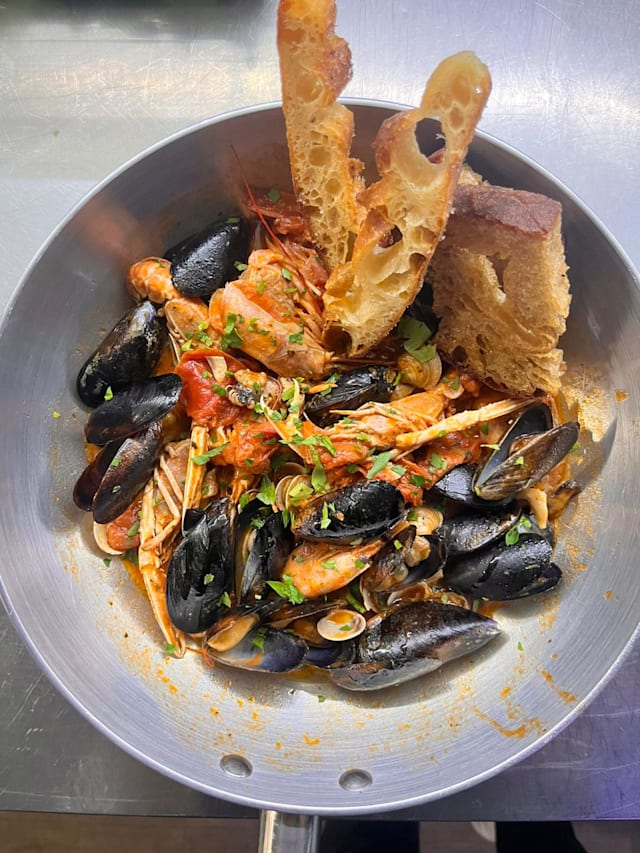 "Il mare è rosso" - zuppetta di mare, con pomodoro, cozze, vongole, totani, gamberi, scampi e pane fritto.