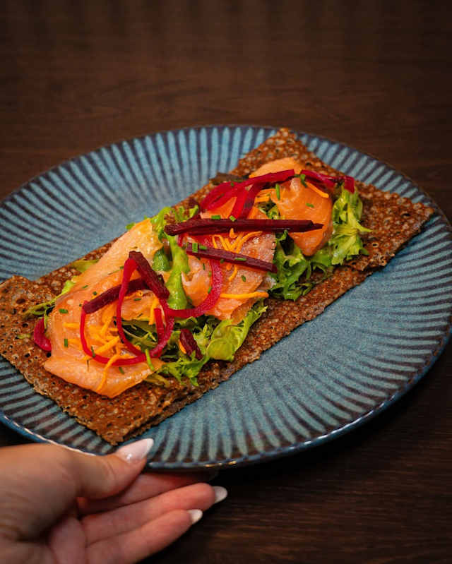 - Saumon fumé, laitue romaine, tomates cerises, oignons pickles maison, concombre, asperges, blinis de sarrăsin, sauce vinaigrette