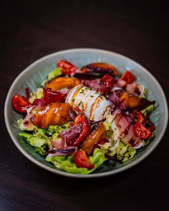 - Laitue romaine, tomates anciennes, mozzarella di bufala, jambon de pays, basilic frais, tomates confites, blinis de sarrasin, crème de balsamique