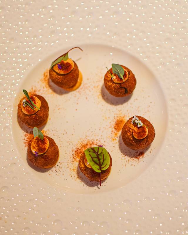 - Ravioli di burrata, pomodorino infornato, caviale di melanzane, basilico, fiori di zucсa