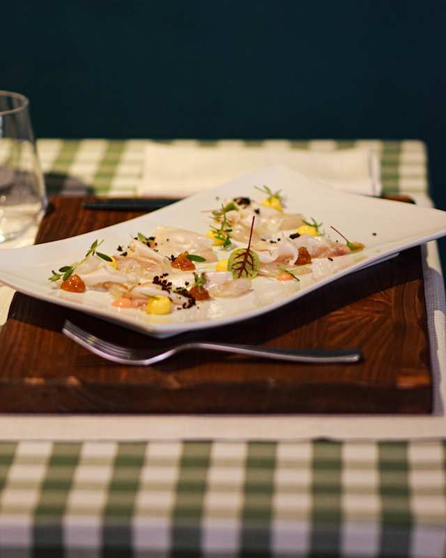 - Carpaccio di manzo, salsa alle erbette, misticanza e grana padano al tartufo