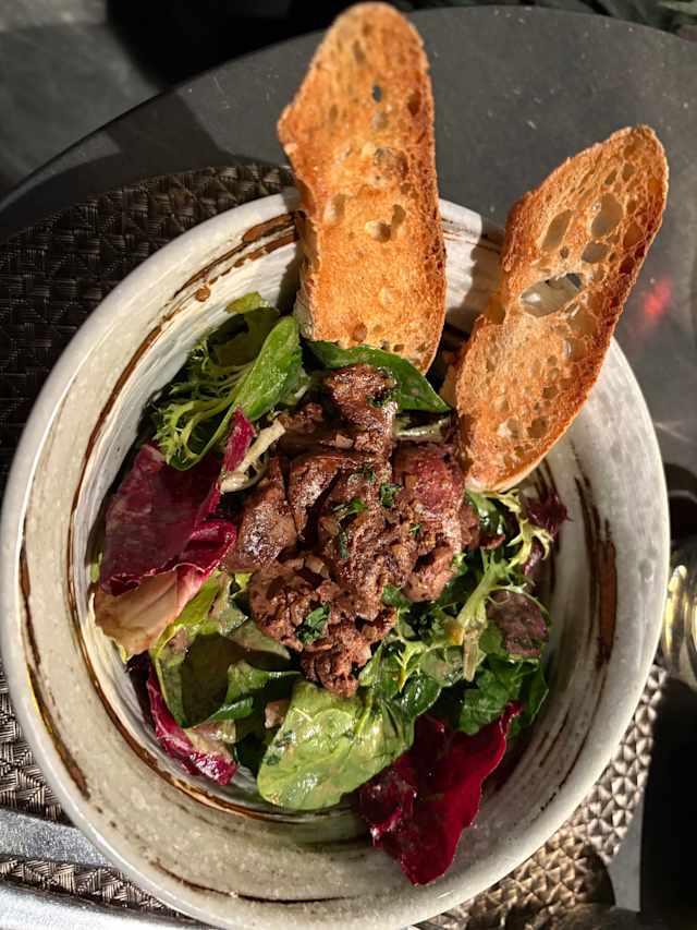 8/10Service was friendly, attentive, and professional. My starter was pan-seared scallops served over a celery-leek combo, with truffle vinaigrette. The warm shellfish were perfectly cooked, but the cold vegetable accompaniment did not suit my tastes. My partner's chicken was delicious, as was my pork dish, although the chop could have been trimmed of fat. There was a nice selection of wines by the glass and, of course, many styles of wine sold by the bottle.