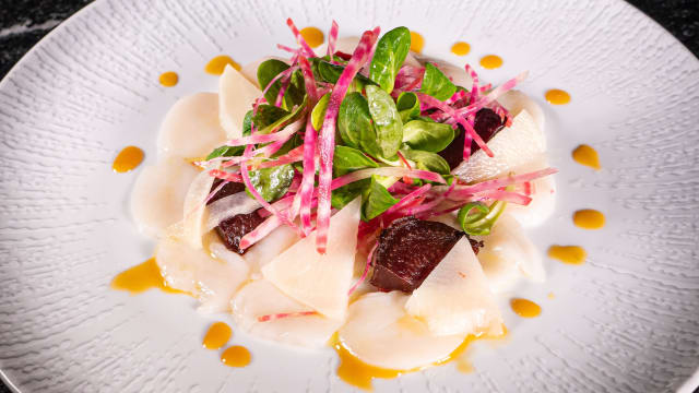 Saint-Jacques snackées, cèleri-poireaux, vinaigrette aux truffes