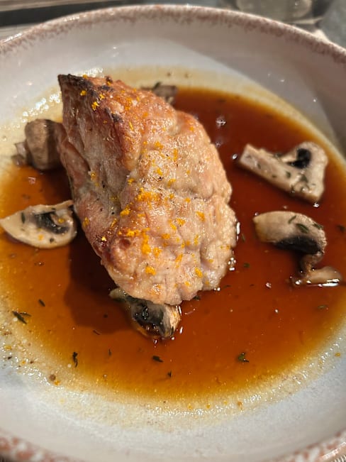 8/10Service was friendly, attentive, and professional. My starter was pan-seared scallops served over a celery-leek combo, with truffle vinaigrette. The warm shellfish were perfectly cooked, but the cold vegetable accompaniment did not suit my tastes. My partner's chicken was delicious, as was my pork dish, although the chop could have been trimmed of fat. There was a nice selection of wines by the glass and, of course, many styles of wine sold by the bottle.