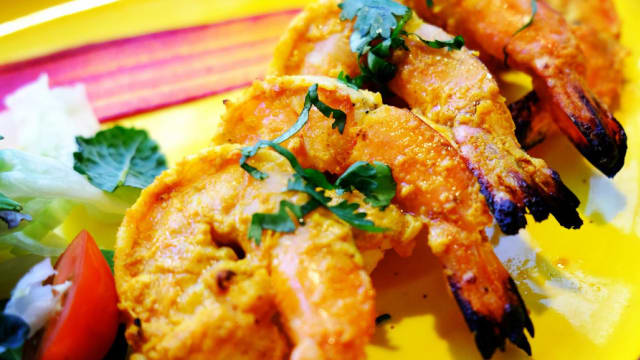 Koninklijke garnalen worden subtiel gemarineerd in een mengsel van yogurt en indiase kruiden. Deze worden doorstoken en gebarbecued in de tandoor oven. Deze gerecht wordt geserveerd met salade en munt yogurt saus.