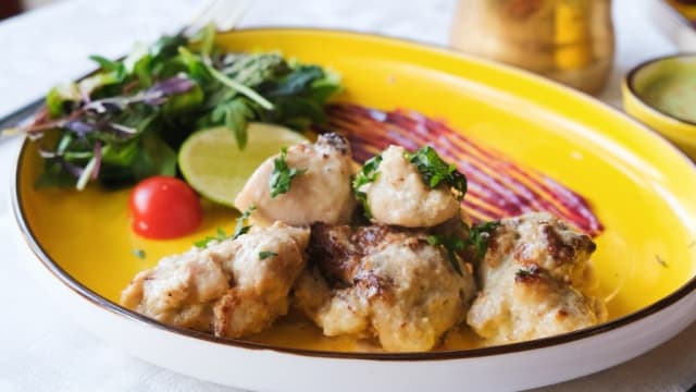 Kipdij zonder been wordt 's nachts gemarineerd in een mengsel van yoghurt en kruiden. Deze wordt doorstoken en geroosterd in de tandoor. Geserveerd met firsse salade en munt yogurt saus.