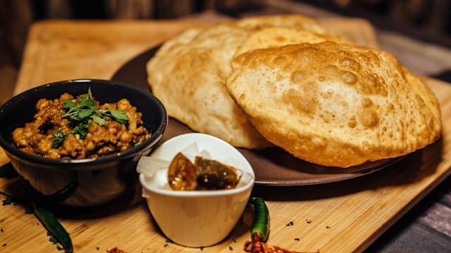 Opperste delicatesse uit noord-india. Het is een gebakken machtige zuurdesem brood. Het wordt geserveerd met kikkererwten en uiensalade.