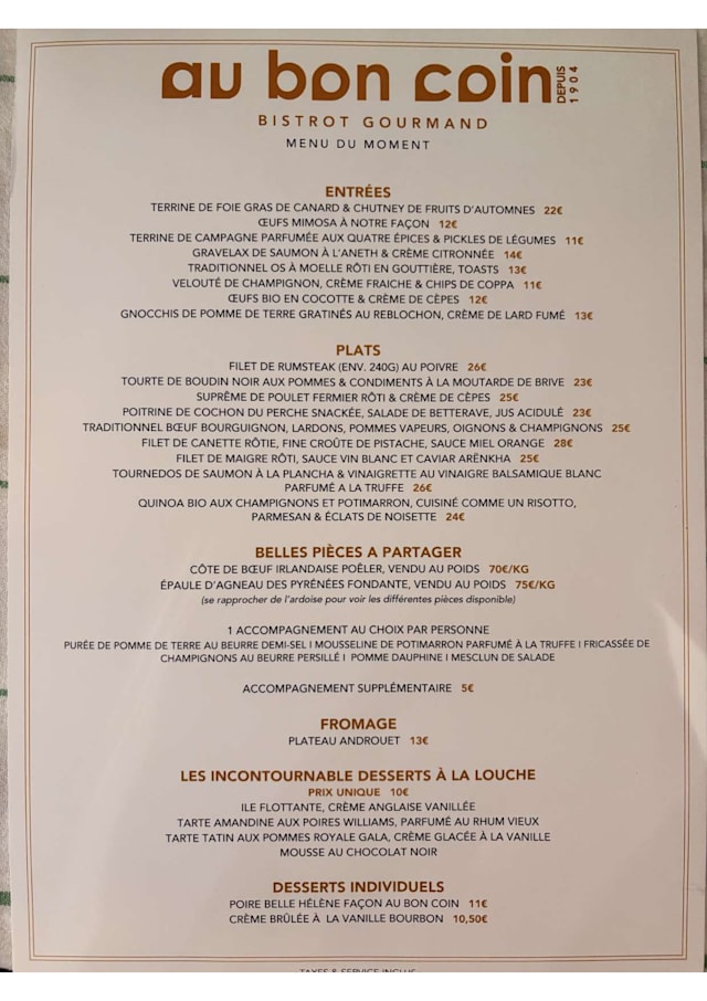 7.5/10We have been to Au Bon Coin twice in the past 6 weeks. The food(rumsteak) was tender and cooked to perfection the first time we ate there, but the 2nd time the steak was tough and undercooked(we had asked for the steak to be cooked medium). The service was excellent on both occasions as was the atmosphere.