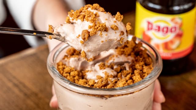 Pommes caramélisées infusées au rhum, pop corn caramélisé, crème glacée vanille, crème fouettée