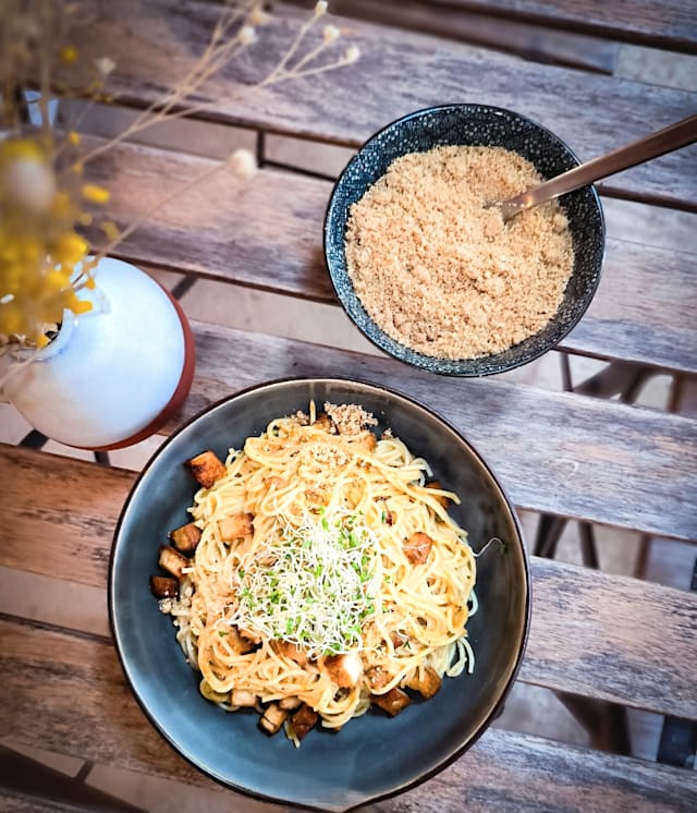 Poivrons grillés, tomates, ail et huile d'olive, relevée avec un soupçon de harissa.