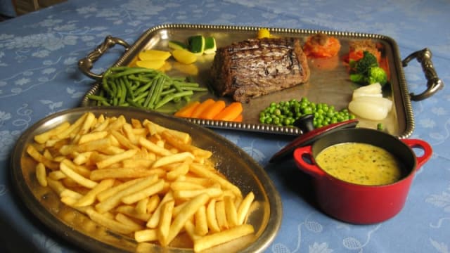 Filet grillé beurre maître d'hôtel, frites et légumes