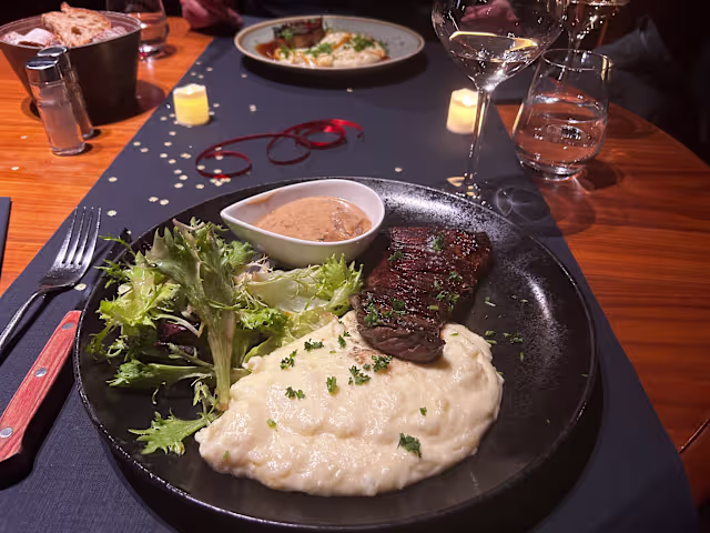 5/10Run out of duck so I had steak instead which was one of worst steaks I’ve ever had (very rare when I asked for medium and difficult to chew). Mash potato was very sloppy (although taste ok to be fair) and they forgot the seasonal veg. Prosecco in a wine glass. On plus side the table was decorated lovely and nice atmosphere. I would not go back next time I visit Annecy.