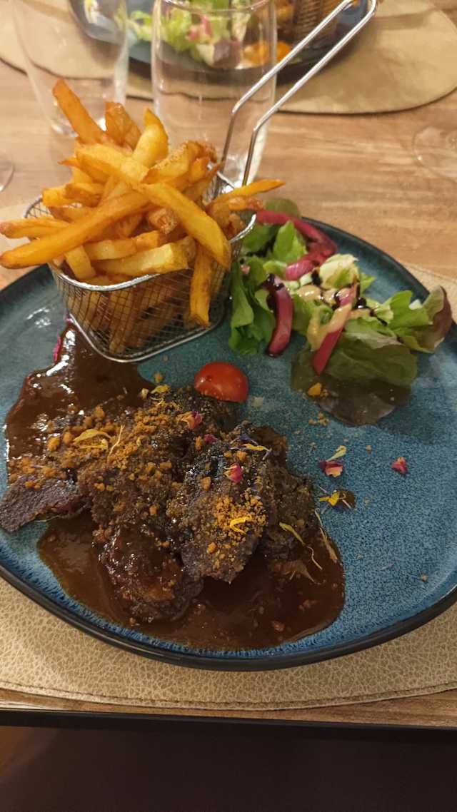 - Joue de Boeuf confit jus réduit à la chicorée frites