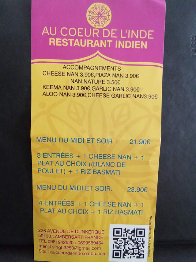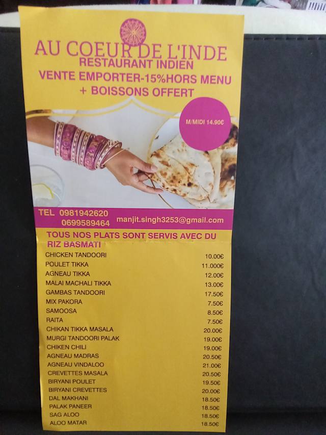 - Menu balade en inde midi et soir 7 j/7 sur place, emporter, livraison