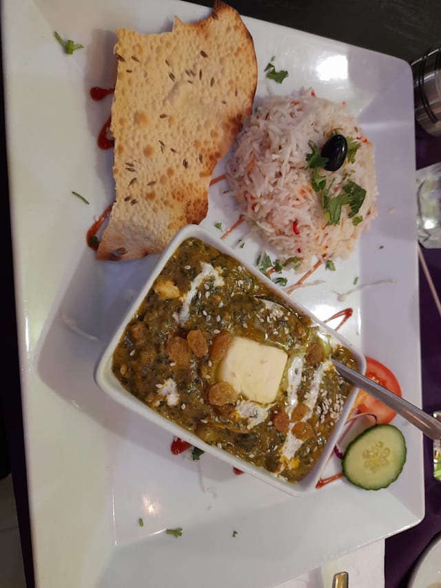 - Épinards aux épices douces à la coriandre et au fromage. Riz basmati à volonté