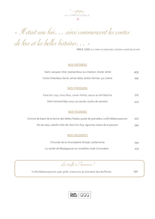 Senator Art T. Our employees are passionate professionals, they know how to listen to everyone in order to best meet the legitimate expectations of the greatest number What a pleasure to read such a comment, whose words of praise for us delight us to the highest degree. "Au Crocodile", a starred gourmet restaurant thanks you very much for your visit, we are happy that you appreciated the serenity and the warm atmosphere of the place, the quality of our service and keep an excellent memory of your taste escapade spent in our "House". Chef Romain Brillat, Amaury Barbado and their team wish you a very pleasant day and a wonderful Christmas.🎄 1 ⭐ Michelin.