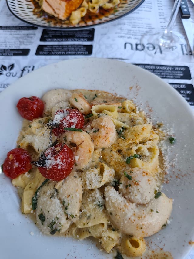 7/10A group of 10 staying long term in the area visited Au fil de l'eau for dinner. Several ordered pizza which were rated okay by the teenagers, the hamburger was rated as a good option, the salmon was good, the chevre salad was consumed with vigor, the camembert option was good but too much, my pasta carbonara was excellent. One of party is celiac and there was but one option of "sans gluten" on the chalkboard, not a regular part of the menu. Seafood tartare. Not a viable option. Only a few restaurants in this region seem to understand, perhaps Paris is more helpful? Our trips to Italy found many more restaurants attentive to patrons' needs. Otherwise, the ambiance of the tables by the river and the ducks with their babies are attractive.